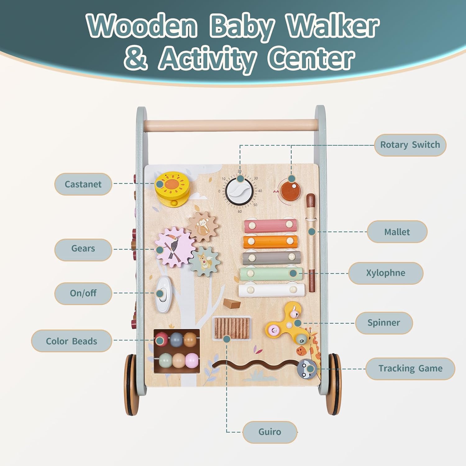 - FLOOR-FRIENDLY DESIGN: Equipped with quiet rubber wheels that protect floors while providing stable support for early walking stages